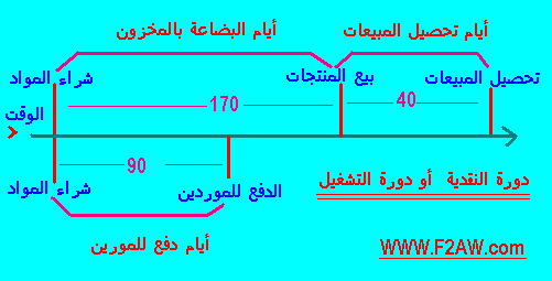 لو أن مثلا المخزون يظل موجود لديك مدة 170 يوم إلى أن يباع و الديون التي على العملاء تحصلها في خلال 40 يوم كمتوسط وتدفع للموردين في خلال 90 يوم كمتوسط